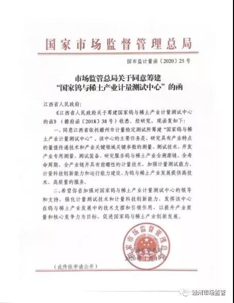 1月19日,國家市場監(jiān)管總局致函江西省人民政府,同意江西省依托贛州市計量檢定測試所籌建“國家鎢與稀土產業(yè)計量測試中心”,這是江西省首家獲批籌建的國家級產業(yè)計量測試中心,對推動贛州建設發(fā)展稀土鎢新型功能材料戰(zhàn)略性新興產業(yè)集群,打通實驗室到產品生產的“最后一公里”具有重要意義。