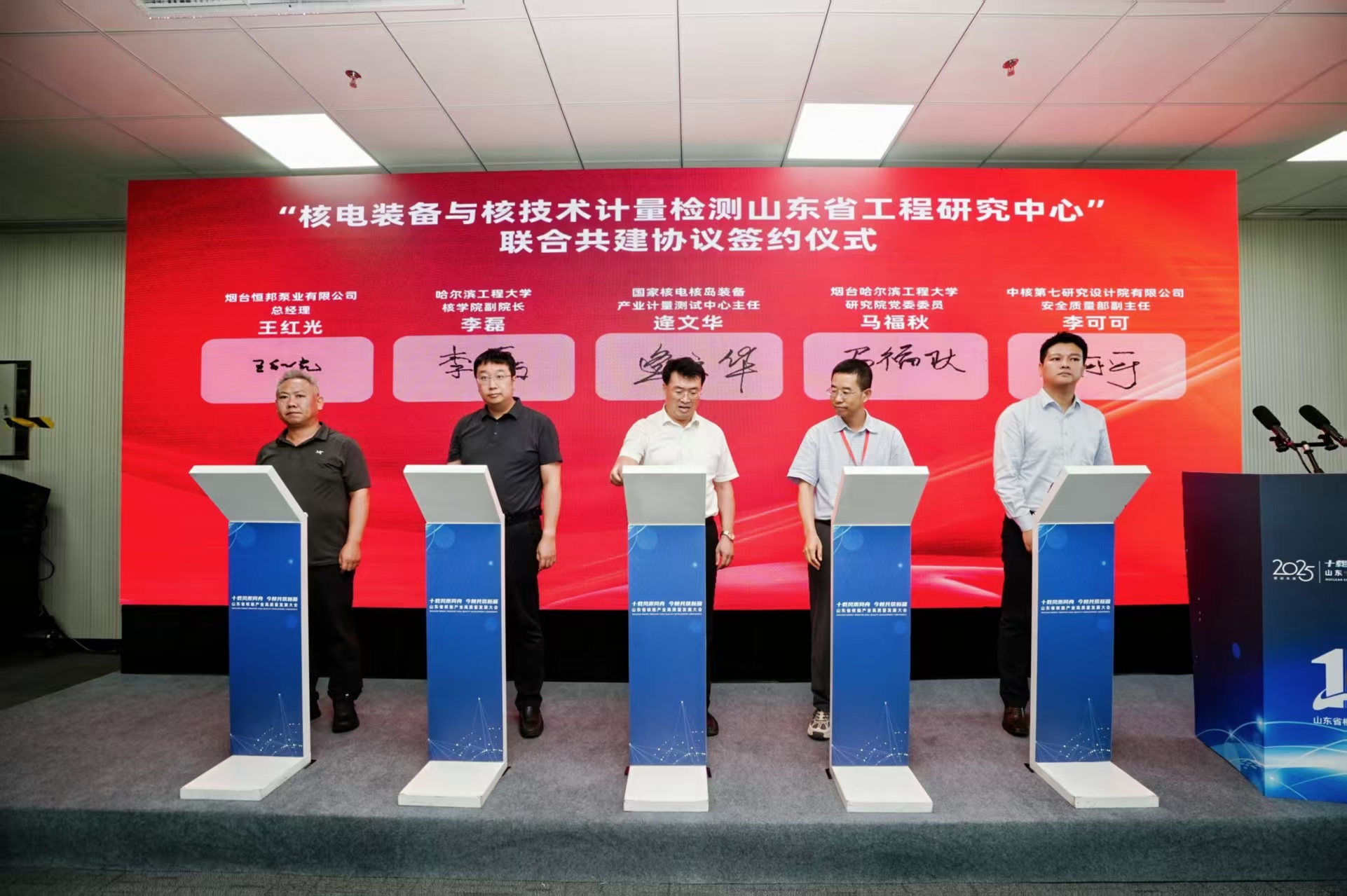 在合作簽約環(huán)節(jié),國家核電核島裝備產(chǎn)業(yè)計量測試中心主任逄文華、中核第七研究設(shè)計院有限公司安全質(zhì)量部副主任李可可、哈爾濱工程大學(xué)核學(xué)院副院長李磊、煙臺哈爾濱工程大學(xué)研究院黨委委員馬福秋教授、煙臺恒邦泵業(yè)有限公司總經(jīng)理王紅光共同簽署“核電裝備與核技術(shù)計量檢測山東省工程研究中心”聯(lián)合共建協(xié)議。此次聯(lián)合共建,匯聚了科研機構(gòu)、高校、企業(yè)等多方力量,將實現(xiàn)資源共享、優(yōu)勢互補,加速核電裝備與核技術(shù)計量檢測領(lǐng)域的技術(shù)突破與產(chǎn)業(yè)應(yīng)用,為工程研究中心的長遠(yuǎn)發(fā)展提供有力保障。