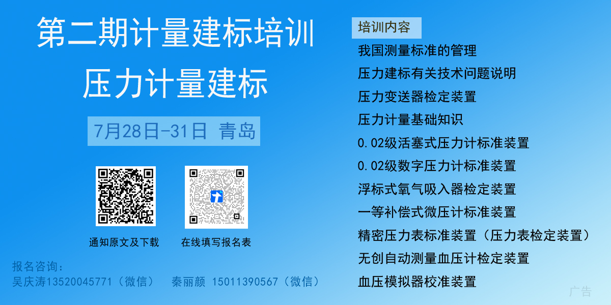 為加強計量人才隊伍建設(shè),指導(dǎo)有關(guān)計量人員更好地開展計量技術(shù)報告編寫,拓展計量人員對多領(lǐng)域/行業(yè)關(guān)于計量的實際應(yīng)用,《中國計量》雜志社將聯(lián)合計量芯舉辦“第二期計量建標(biāo)培訓(xùn)(壓力計量建標(biāo))”,授課老師以新版《壓力計量器具建標(biāo)指南》教材主創(chuàng)人員和編委會成員為主?,F(xiàn)將相關(guān)事宜通知如下: