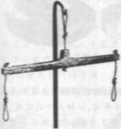 這架天平還明顯保留著原始天平的缺陷:通過橫梁上鉆的空洞吊起繩子作為支點,其等臂性很難保證,加之繩子的摩擦力較大,導(dǎo)致天平的靈敏度極低,稱重的精確度受到很大限制。這種天平的準(zhǔn)確度大概只有1%,甚至更差一些。
