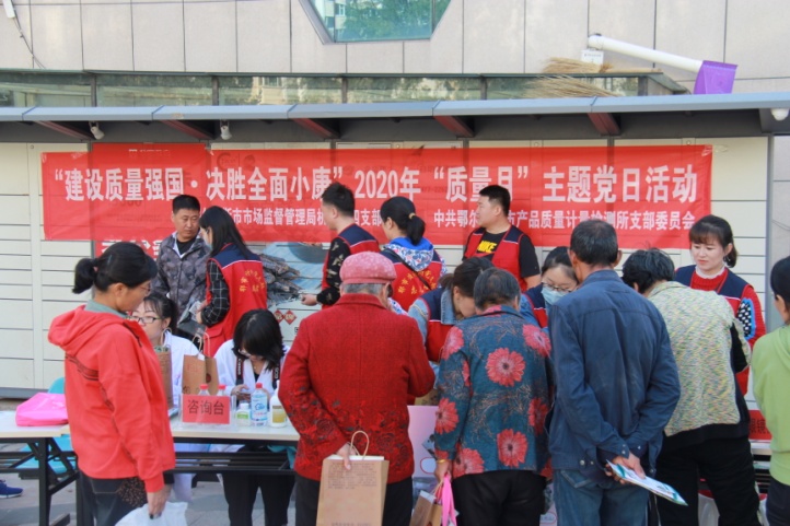 二是開展相關(guān)主題黨日活動。9月24日,市質(zhì)計所黨支部帶領(lǐng)黨員同志和專業(yè)技術(shù)人員到康巴什珠江社區(qū)開展“建設(shè)質(zhì)量強(qiáng)國 決勝全面小康”2020年“質(zhì)量月”主題黨日活動?;顒釉O(shè)立了咨詢臺、眼鏡檢測臺、血壓計檢測臺、人體秤檢測臺等,為居民開展了檢驗(yàn)檢測現(xiàn)場服務(wù)和咨詢,并發(fā)放了民用計量器具知識、計量保障質(zhì)量知識宣傳冊和小紀(jì)念品共計300余份,營造了追求質(zhì)量、關(guān)注質(zhì)量的良好氛圍。