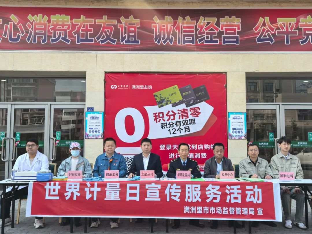 為積極響應(yīng) 2025 年世界計(jì)量日“計(jì)量順時(shí)代之需,應(yīng)民生之盼”主題號(hào)召,在第26個(gè)“世界計(jì)量日”(5月20日)來(lái)臨之際,滿洲里市市場(chǎng)監(jiān)督管理局聯(lián)合滿洲里市檢驗(yàn)檢測(cè)中心、國(guó)網(wǎng)滿洲里市供電公司、大商友誼商貿(mào)有限公司、錦源水務(wù)公司、平安實(shí)業(yè)公司,在友誼購(gòu)物中心門前組織開展了“5·20”世界計(jì)量日宣傳服務(wù)活動(dòng)。
