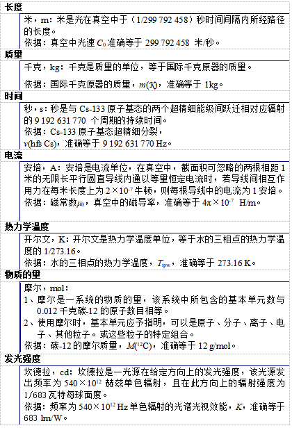 SI不是固定不變的,而是為適應(yīng)世界上不斷增加的測量需要而發(fā)展的,這些測量包括與科學(xué)、技術(shù)和人類活動相關(guān)的所有領(lǐng)域和所有準(zhǔn)確度水平。目前七個基本單位的定義[3][4]如下: