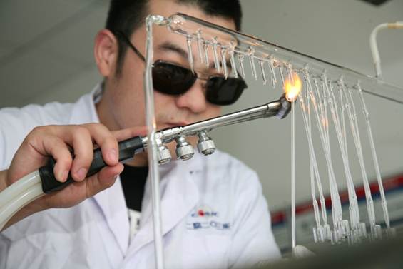 手穩(wěn)不穩(wěn),直接影響玻璃的均勻度。稍有不慎,玻璃焊接出來就是彎曲的,甚至導(dǎo)致銣泡破裂。為了提高成品率和質(zhì)量,張文沖就拿根玻璃管,反復(fù)練習(xí)焊接,這樣一練就練了半年,光是玻璃管就用了好幾袋子,正是這樣反復(fù)的練習(xí),練就了一手準(zhǔn)的“絕活”。一眨眼的工夫就將兩根玻璃管準(zhǔn)確無誤對接上,因?yàn)樗钪坏┎鸾?,就意味著廢了,意味著產(chǎn)品成本。