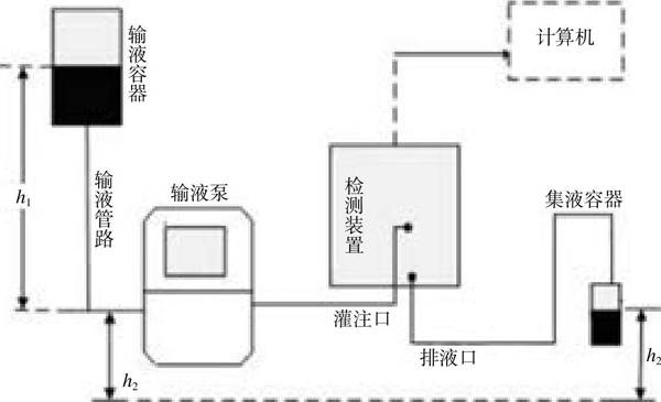 圖1中,h1為輸液容器到輸液泵的高度;h2為輸液泵的輸入端、測(cè)量系統(tǒng)輸出端到同一水平面的高度,二者高度應(yīng)相同。校準(zhǔn)方法:按圖1方式連接好校準(zhǔn)裝置,向管路中灌注液體,保證管路中無(wú)空氣。根據(jù)被校儀器的使用范圍,選擇合適的校準(zhǔn)點(diǎn),從檢測(cè)儀及被檢輸液泵讀數(shù)流量值,并計(jì)算流量誤差值、流量重復(fù)性值。需要注意的是,對(duì)于同時(shí)期瞬時(shí)流量和平均流量測(cè)量功能的檢測(cè)儀,應(yīng)記錄平均流量讀數(shù)。