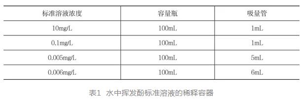 配制0.005mg/L和0.006mg/L水中揮發(fā)酚標(biāo)準(zhǔn)溶液稀釋所用的量器如表1所示(標(biāo)準(zhǔn)物質(zhì)母液濃度為1000mg/L),其中5mL單標(biāo)線吸量管的容量允許誤差為±0.015mL,量取6mL的溶液需要的10mL分度吸量管的容量允許誤差為±0.05mL,兩者配制過程中引入的不確定度顯然配制0.005mg/L的小。除了水中揮發(fā)酚,其他測(cè)量成分的測(cè)量點(diǎn)也類似,可稍微變通一下。