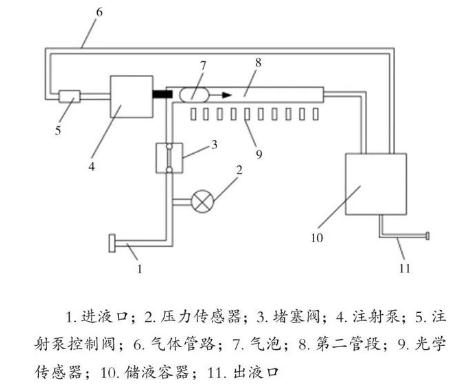 儲液容器10構(gòu)造為回收測試液體,一般來說,測試液體可以為水或者經(jīng)染色劑染色而便于觀測的溶液。第一管段具有一進液口,其上設(shè)置有用于測量管路內(nèi)測試液體的壓力的壓力傳感器2,第二管段為透光管路(例如玻璃材質(zhì)的管路)且外側(cè)設(shè)置有光學(xué)傳感器9,儲液容器10設(shè)置有一出液口。注射泵4的輸出端連接至第二管段8,且其輸入端通過一氣體管路6連接至儲液容器10。在一些實施案例中,如圖1所示,可以在氣體管路6上增設(shè)注射泵控制閥5,并且為了便于精確測量,設(shè)置在第二管路8外側(cè)的光學(xué)傳感器 9也可以并列且等距設(shè)置有多個。