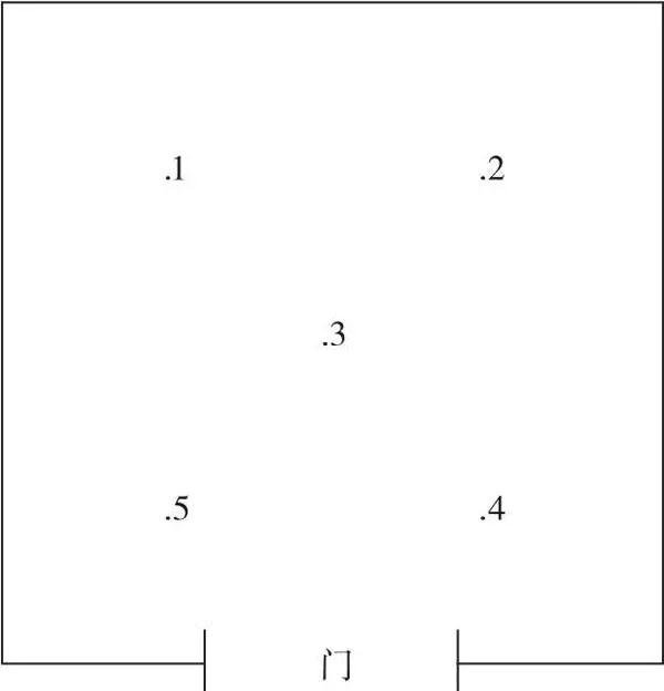 一般真空箱的工作空間體積小于0.4m3,因此,選取工作空間的中層作為測試平面。中層為通過工作室?guī)缀沃行牡钠叫杏诘酌娴男?zhǔn)工作面,測試點(diǎn)與工作室內(nèi)壁的距離不小于各邊長的1/10,測試點(diǎn)的位置布局及數(shù)量,如圖1所示。工作空間體積大于0.4m3的真空箱,測試點(diǎn)的數(shù)量可以適當(dāng)增加至9個或更多,其測試點(diǎn)的位置布置可以參考JJF1101-2003《環(huán)境試驗設(shè)備溫度、濕度校準(zhǔn)規(guī)范》中的測試點(diǎn)位置布置圖。