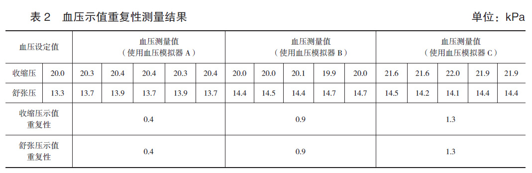 用膠管和三通把電子血壓計與袖帶、血壓模擬器連接,袖帶卷扎在相應尺寸的硬質(zhì)金屬容器上,松緊適宜,血壓模擬器采用外置袖帶模式且設置成對收縮壓和舒張壓,由電子血壓計對血壓模擬器加壓測量,記錄電子血壓計顯示的收縮壓和舒張壓示值,測量結(jié)果如表2所示。