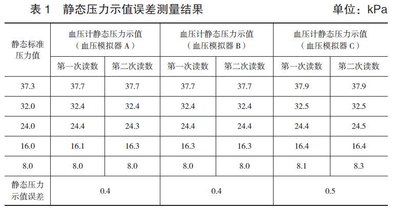 使用該型號電子血壓計的靜態(tài)壓力測量專用接頭,用膠管和三通把電子血壓計與金屬容器、標準器連接起來組成檢定系統(tǒng)。將電子血壓計調(diào)至靜態(tài)壓力測試模式,在電子血壓計規(guī)定的靜態(tài)壓力范圍內(nèi),標準器設定5個檢定點,由標準器對電子血壓計逐點從高到低降壓,重復進行2次壓力測量,測量結(jié)果如表1所示。