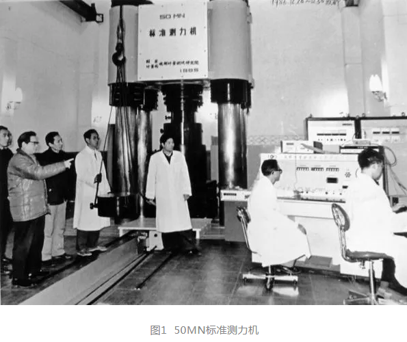 1978年起,我開始承擔(dān)“20MN(2000噸力)液壓式基準(zhǔn)測(cè)力機(jī)”課題組長(zhǎng),到1981年才落實(shí)承制廠。1977年起,計(jì)量分院著手研制力源式50MN(5000噸力)標(biāo)準(zhǔn)測(cè)力機(jī)。同年5月,我與計(jì)量分院何文炫在上海調(diào)查大力源,即2000~5000噸力油壓機(jī)。因?yàn)?0MN標(biāo)準(zhǔn)測(cè)力機(jī)的基礎(chǔ)就是5000噸力油壓機(jī)。1979年4月,我在成都參加了計(jì)量分院召開的第一次“5000噸力力源方案”討論會(huì)。1981年6月我參加了計(jì)量分院在桂林召開的第二次“5000噸力力源方案討論會(huì)”,大家一致認(rèn)為2000噸力以上采用力源式來(lái)建立標(biāo)準(zhǔn)測(cè)力機(jī)是正確的選擇。1986年下半年,5000噸力標(biāo)準(zhǔn)測(cè)力機(jī)研制成功,同年12月下旬,我主持了“50MN標(biāo)準(zhǔn)測(cè)力機(jī)鑒定會(huì)”,這臺(tái)測(cè)力機(jī)安裝在計(jì)量分院大邑基地(見圖1)。