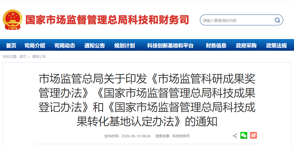 為建立和完善市場(chǎng)監(jiān)管科技創(chuàng)新管理制度,做好市場(chǎng)監(jiān)管科研成果獎(jiǎng)評(píng)選表彰、科技成果登記和科技成果轉(zhuǎn)化應(yīng)用,總局制定了《市場(chǎng)監(jiān)管科研成果獎(jiǎng)管理辦法》《國(guó)家市場(chǎng)監(jiān)督管理總局科技成果登記辦法》和《國(guó)家市場(chǎng)監(jiān)督管理總局科技成果轉(zhuǎn)化基地認(rèn)定辦法》,經(jīng)總局局務(wù)會(huì)審議通過(guò),現(xiàn)予以印發(fā),請(qǐng)認(rèn)真貫徹執(zhí)行。