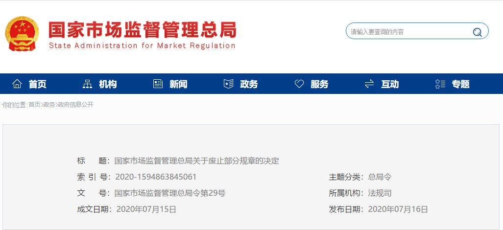 《國家市場監(jiān)督管理總局關(guān)于廢止部分規(guī)章的決定》已于2020年7月7日經(jīng)國家市場監(jiān)督管理總局2020年第5次局務(wù)會議審議通過,現(xiàn)予公布,自公布之日起施行。